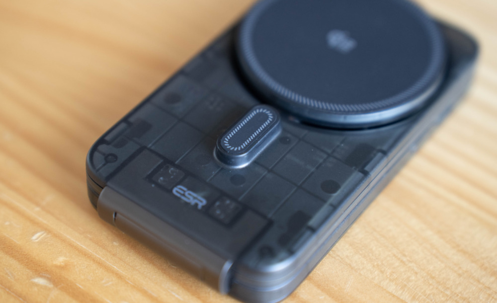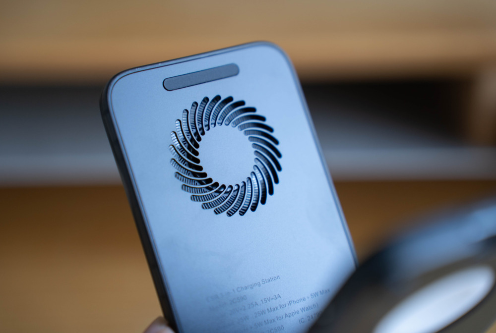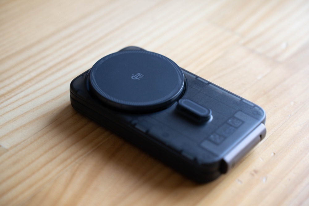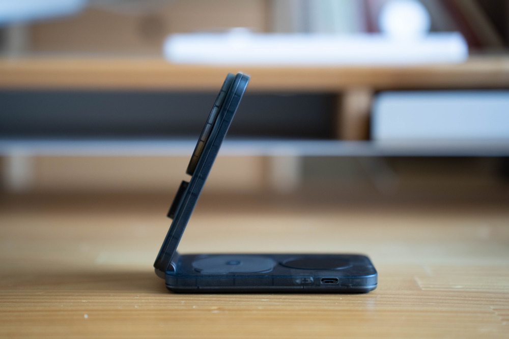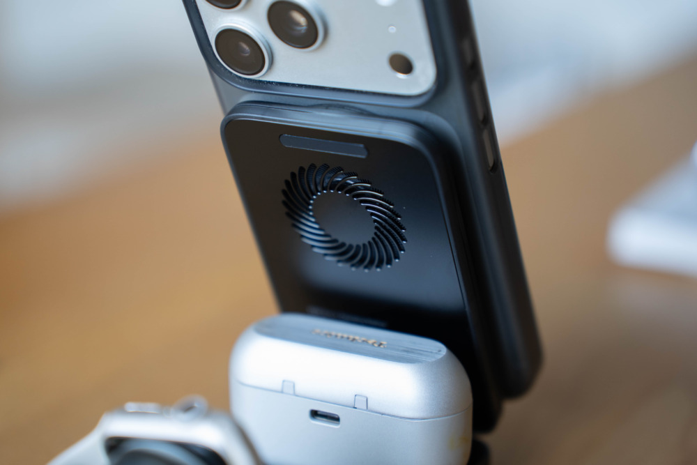 前面にはQi2 25W対応スマホ用の充電パッドをそなえ、一見するとMagSafeモバイルバッテリーのような筐体。スペック値で15.8mmと小指くらいの厚みしかなく、「これが本当に3-in-1のワイヤレス充電器なのか?」と良い意味のギャップを楽しめます。