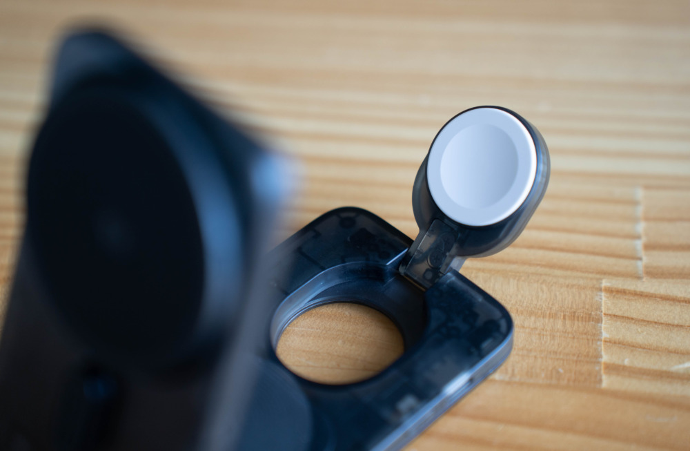 そして台座部の手前部分。裏面からクルッと返すことで、Apple Watch用の磁気充電パッド(5W)が顔を出します。