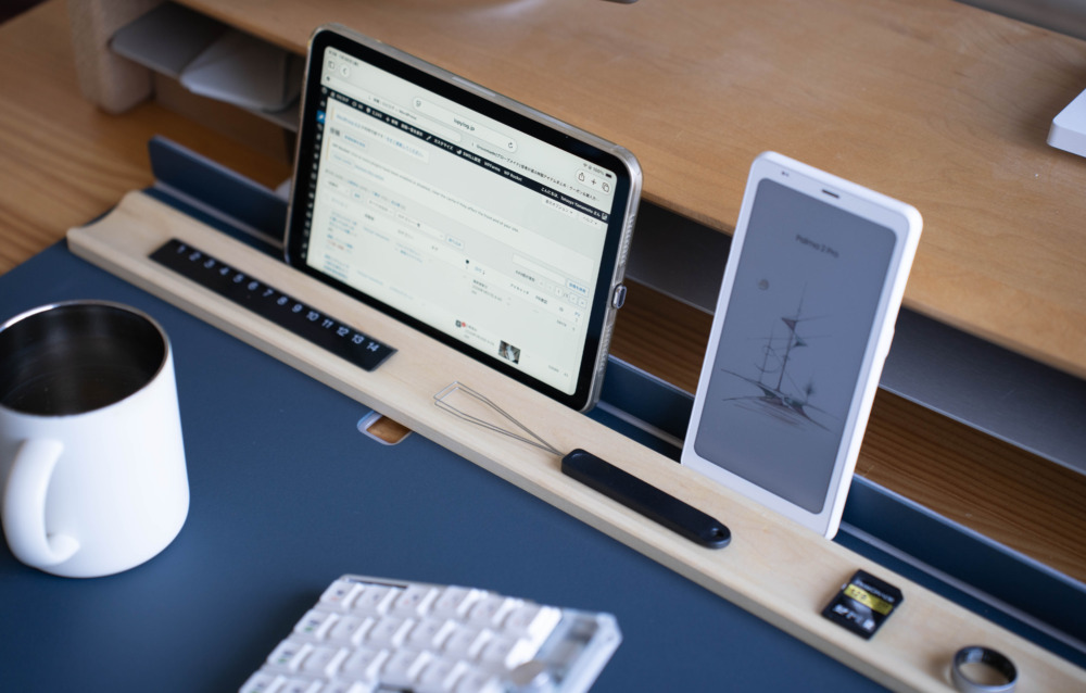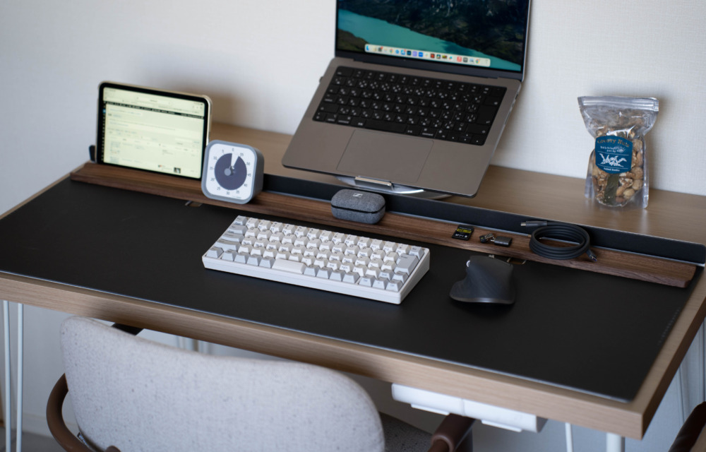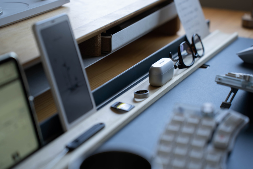で、注目なのが上部。ウォルナットの木材が横一直線に流れていて、ペンやら小物ガジェットを置くプチトレーとして活用できます。デスク周りってワイヤレスイヤホンやSDカードなど細々した物が散らかりがちなので、小物の定位置化に思いの外役立ってくれてます。
