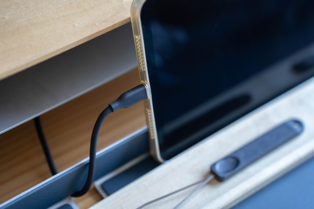 さらにその木材の後ろ側には小さなスリッドが施されていて、この部分にスマホやタブレットなど立てかけてスタンド的な使い方ができるんです。このスタンド機能がとにかく便利。