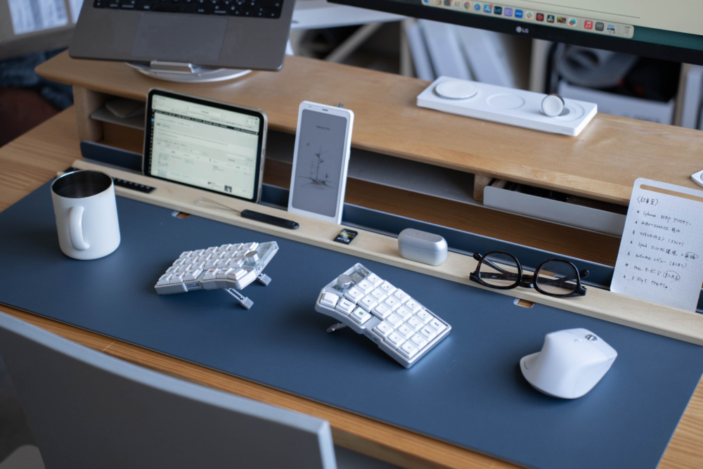 同社のデスクシェルフ(largeサイズ)の下にそのまま滑り込ませて収納できるよう設計されているので、使わない時のデバイスのホコリ防止だったり、アナログ用とでデスクを使う際も広々とスペースを保つことができます。