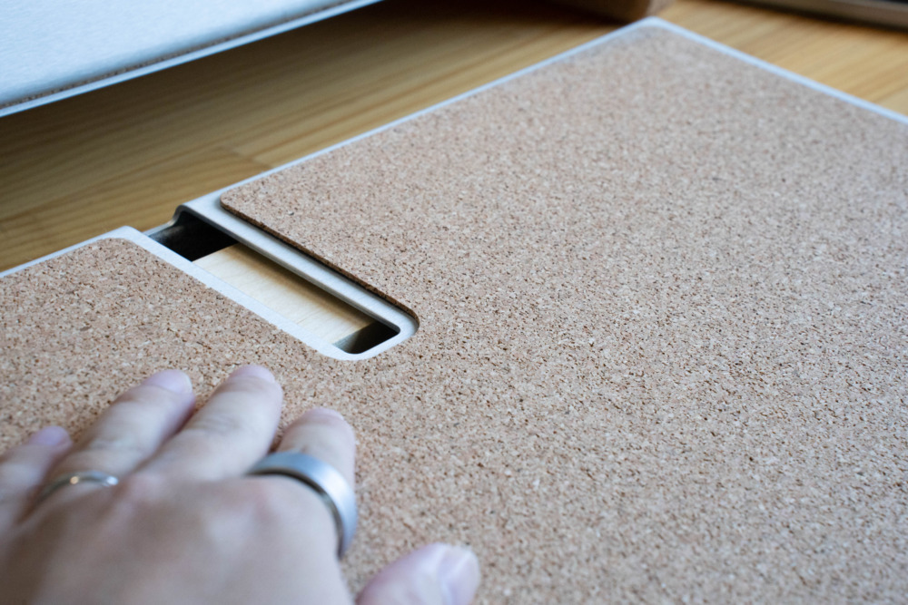 裏面はコルク張りになっていて広いデスク範囲をしっかりと支えてくれ、キーボードやマウスなど操作デバイスを安定させてくれるという効果があります。