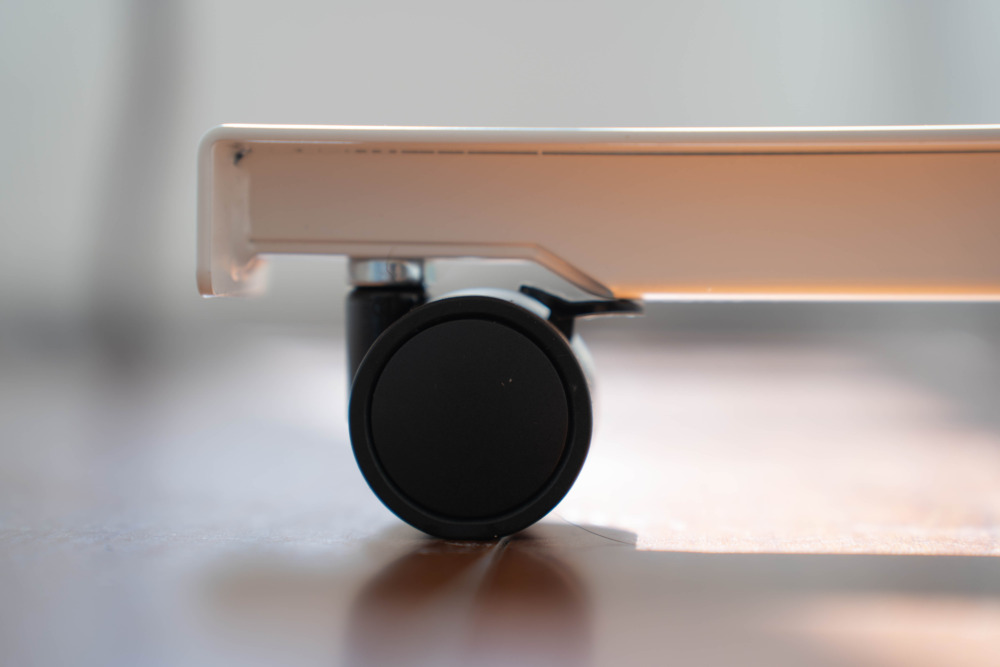実際にキャスターを設置して1ヶ月使ってみたところ、動きは滑らかですし、フローリングにダメージがいく様子もないので引き続きこの運用でいこうかなと。先述の通り、天板の最低位置が低いおあかげで、座り姿勢時にキャスターぶん高さが出過ぎてしまう、みたいなことも僕の場合はないですね。