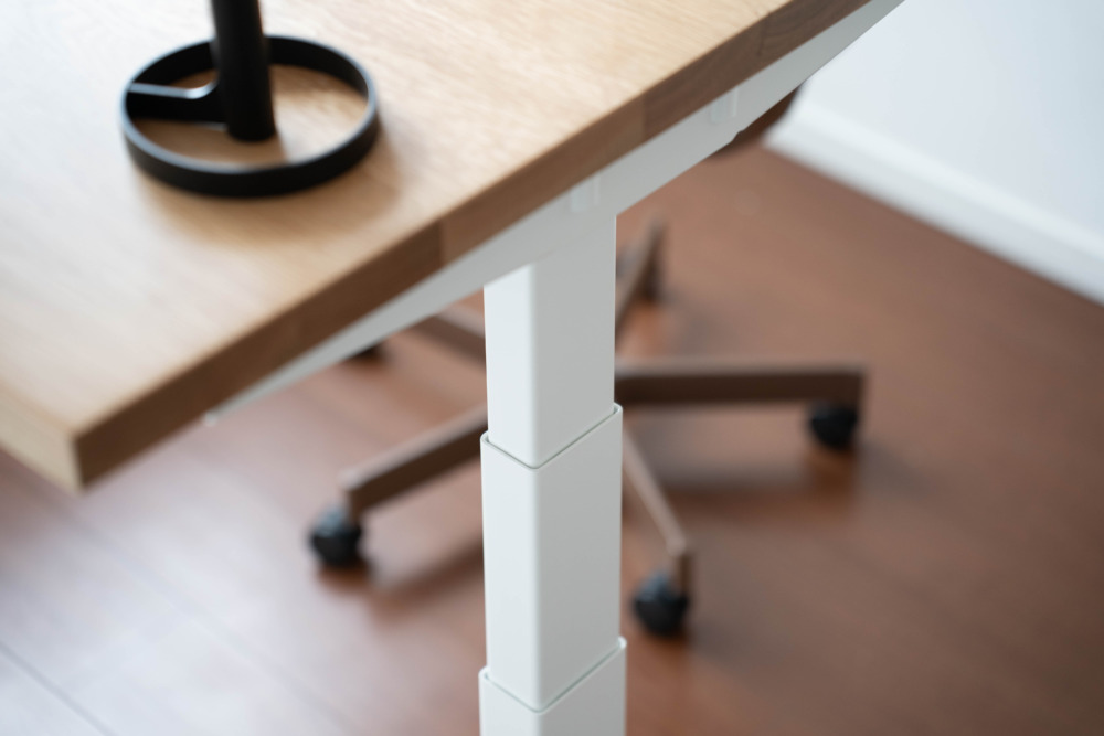 LINAKの昇降脚は他社メーカーに比べて細身ということもあり、全体的にずいぶんとスッキリとした印象です。昇降デスクの機械っぽさみたいなものが最小限で、ごく一般的なワークデスクのようなスマートな存在感。