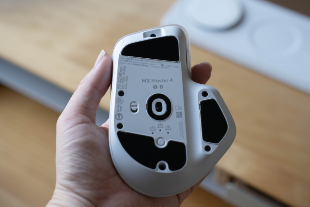 一方、MX Master 4は微細パターンを施したマイクロテクスチャの樹脂製カバーを採用し、汚れにも傷にも強い。マウス先端の透明プレートも、強度を上げる新仕様。マウスは毎日のように使うものなので、こうした実用に直結するアップグレードはありがたいですね。それこそ筆者の様に既存モデルを使用していて加水分解など起こしてる場合は、この点だけでも十分乗り換える価値があると思います。