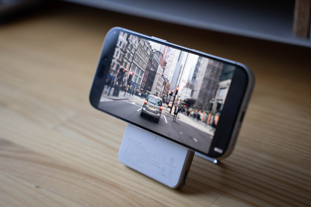 もちろん、横置きもOK。しかも、モバイルバッテリー横のボタンを押せば、充電をOFFにして、スタンド機能のみを利用することもできました。