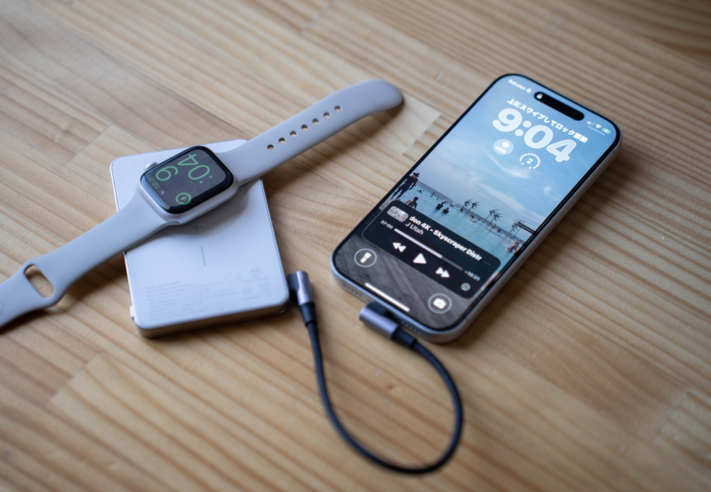 このバッテリーの最大の特徴は、「Apple Watchの充電器」としても使える点です。これは、出張や旅行の際に、Apple Watch専用の長い充電ケーブルを、わざわざカバンに入れなくて済むということを意味します。