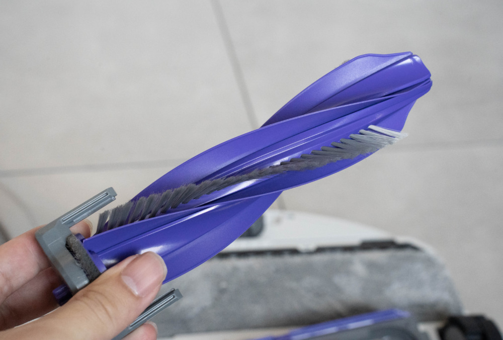 ほかでは見たことのないスクリュー形状が特徴的なこちらのブラシ。従来の、軸を左右両端で固定する仕組みではなく、片側の軸だけでブラシを回転させる構造になっています。ブラシ自体もゴミを片側に寄せるような形状をしており、髪の毛や糸状ゴミの絡まりを限りなく減らしてくれるのだそう。
