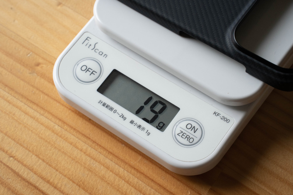 重量は約19gと、各社ケースと比べても最軽量クラスとなります。高い保護性能と軽さを両立しているというのがPITAKA Ultra-Slim Caseの最大の特徴。