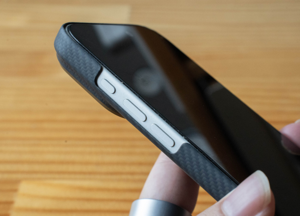 PITAKAのケースは可能な限り軽量化されているためサイドのボタン類はオープン設計になっています。このあたり、保護力が気になる・・という人もいるかと思います。一応数年使った経験上で言うと、傷はつけたことないです。ただ。汚れます。なので、定期的に拭いてあげる方がいいですね。