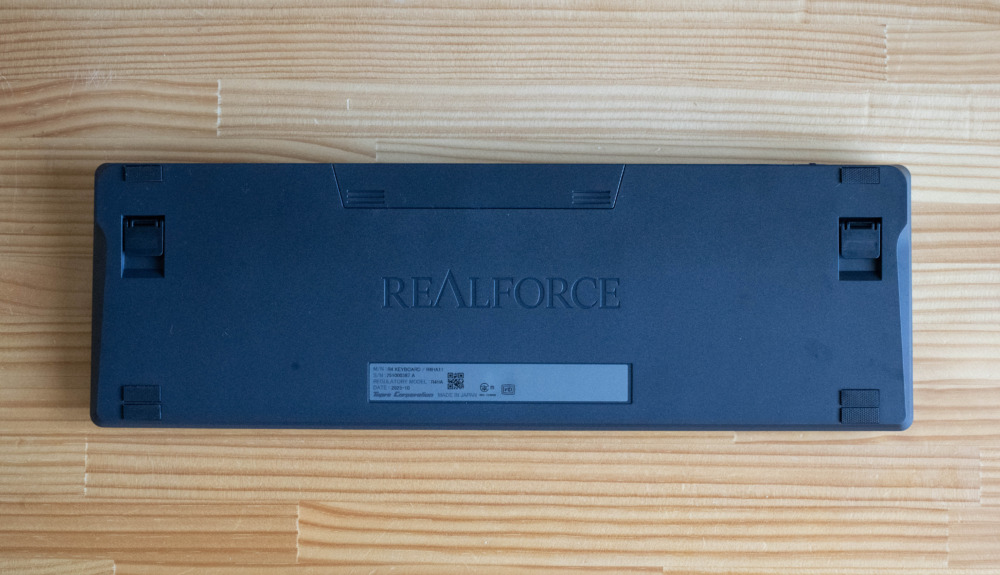 底面には「REALFORCE」のロゴ刻印。滑り止めラバーは下部に2つ連立したものが左右に配置されており、上部は左右に各1つというレイアウト。グリップ力も十分に備わっており、安定したタイピングを実現しています。