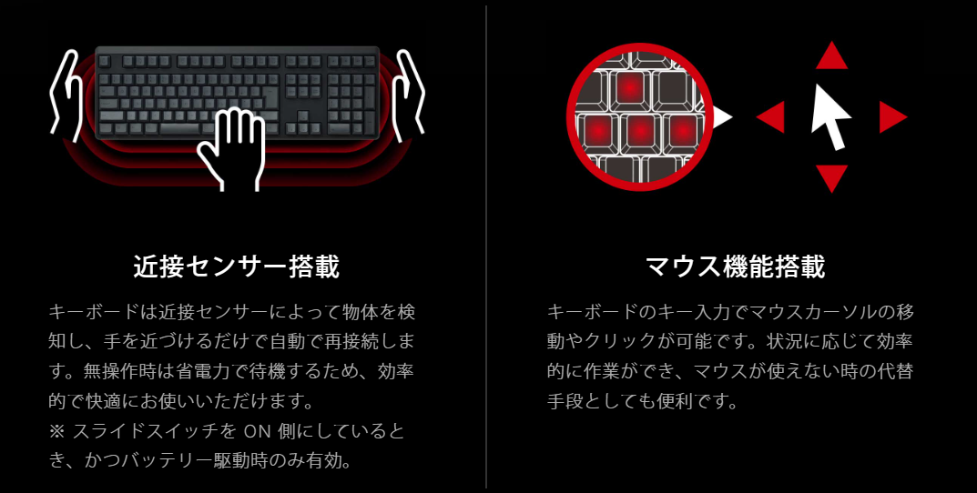 近接センサー機能は、手前・左右の3辺に備えたセンサーで無操作時は省電力待機 → 手を近づけるだけで自動復帰する仕組みです。離席、着席の多い環境でも使い勝手がよく、無線接続時でも省電力で運用できる点がメリットです(電源スライドをONかつ電池駆動時のみ有効)。
