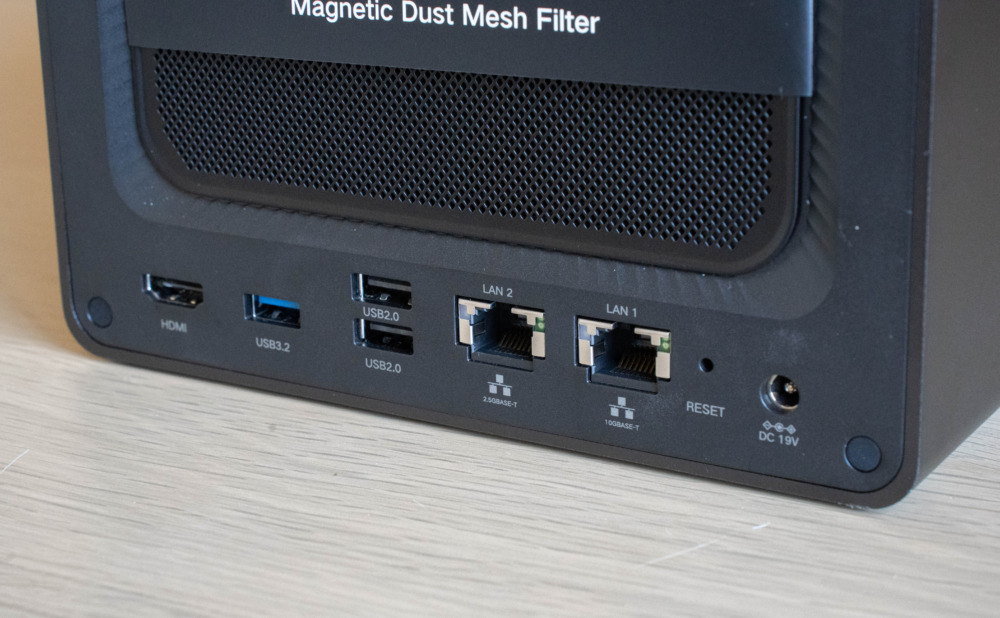 背面側はHDMIとUSB-A(USB3.2×1、USB 2.0×2)、10GbE/2.5GbEのデュアルイーサネット、リセットボタン、電源ポートです。HDMIでテレビ等に接続するとNASの中の画像や動画をテレビの大画面で楽しむこともできます。