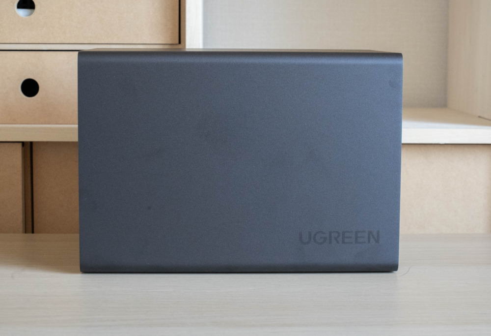 側面は何もなく隅にUGREENロゴがあるのみです。アルミ押し出し材で作られた丈夫なキューブ型ケースは、同社充電器がそのまま巨大化したようなシンプルを極めたデザイン。