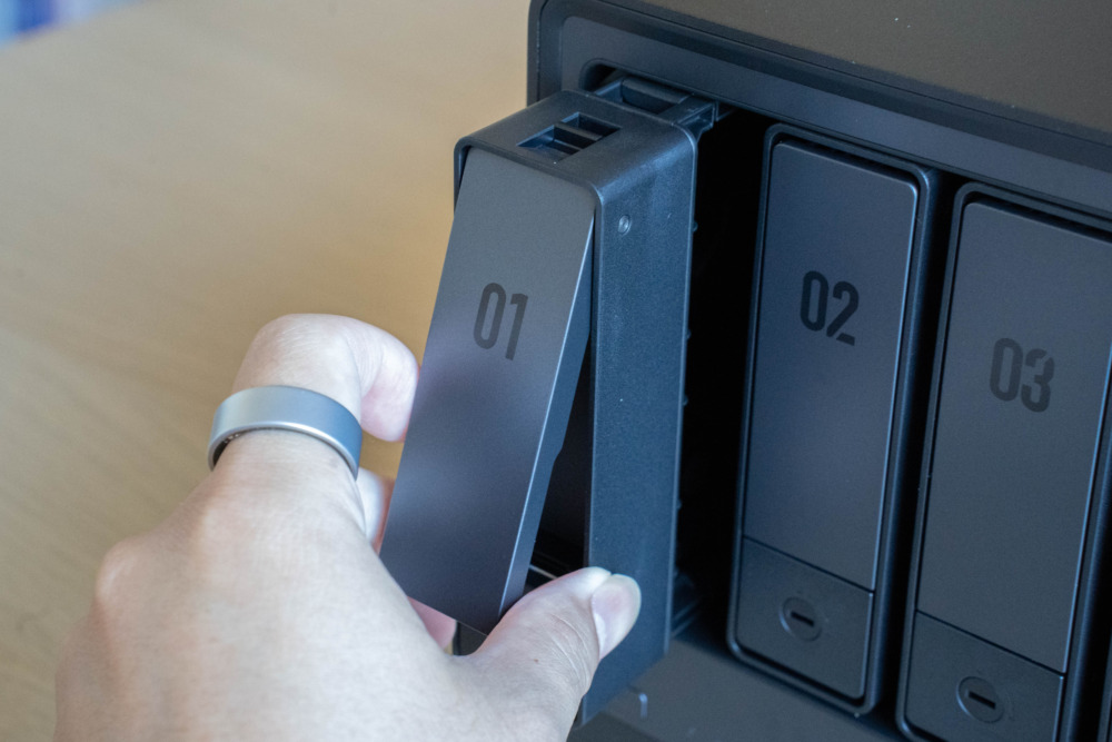 続いてNASync DXP4800 Plusの使用手順ですが、まずはNASのロックを外してスロットを取り外します。