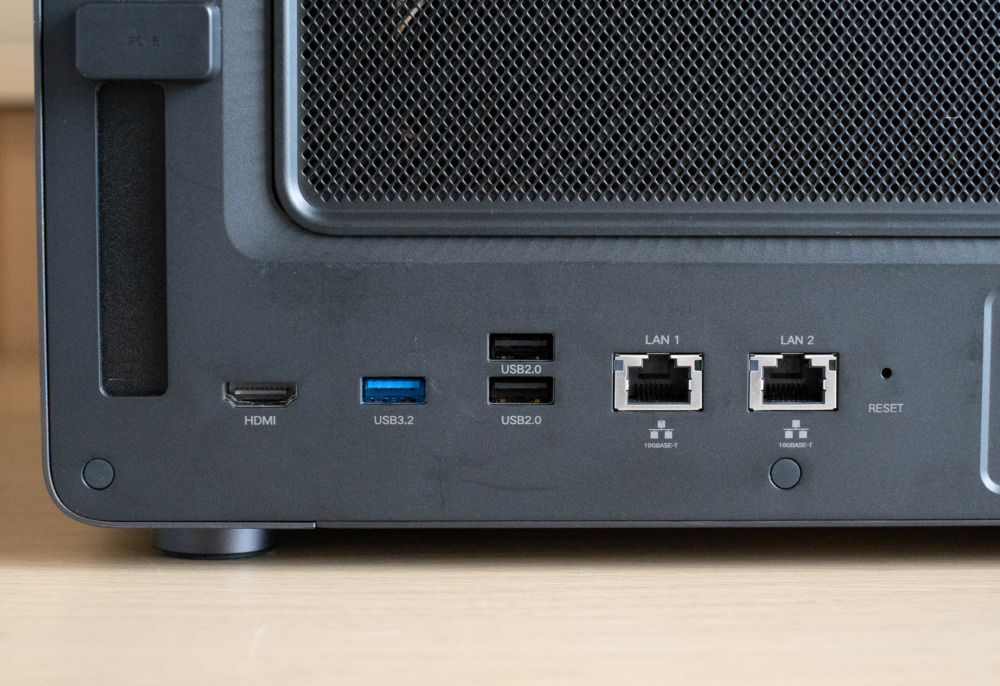 背面にはNASとして利用するのに必要十分なポートを装備。専用スマホアプリの「UGREEN NAS」で、NAS上に保存している動画を選んでディスプレイやテレビに映像出力できるHDMIポートが1基、USB 3.1 Gen 2 Standard-Aポートが1基、USB 2.0 Standard-Aポートが2基と、NASとは思えない充実ぶり。