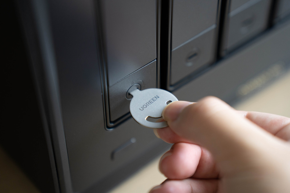 HDDのトレイにはそれぞれ簡易的な鍵穴が用意されており、付属の鍵でロックすることで不意なHDDの取り外しを防げる仕様です。お子さんがいる家庭であれば、いたずら防止に活用できますし、故障したHDDを交換する際のオペレーションミスを防ぐ役割も果たしてくれます。