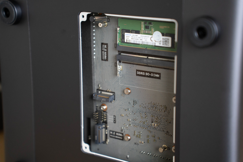外部のインターフェースの充実ぶりはさることながら、高い拡張性も併せ持つDXP6800 Pro。底面カバーを開けるとDDR5 SO-DIMMスロットとM.2 NVMeスロットがそれぞれ2つずつ搭載されていることがわかります。