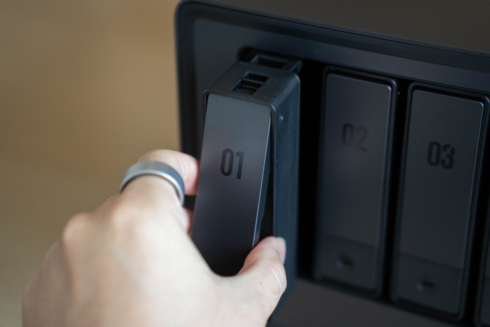 外観のインダストリアル的な魅力もさることながら、HDDを交換する際に目的のHDDを探しやすいという実用性も。NAS製品によっては、マニュアルを見ながら正しいトレイを特定しなければなりませんが、DXP6800 Proは本体を見るだけで交換対象のHDDを特定できるのが非常に扱いやすいです。