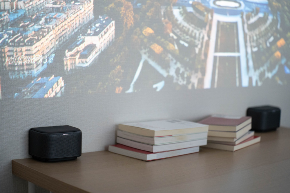 分離型のステレオスピーカーは、投影した映像の脇に置くのが基本スタイル。ですが、寝室で布団やベッドに寝転がりながら映像を見るときは、あえてスピーカーを枕元に置く「手元スピーカー」にできたり、リビングで映像投影しながらキッチンにスピーカーを持ってきてノイズに邪魔されずコンテンツが楽しめたりと、実際に導入してみると分離型スピーカーならではの良さはいろんなシーンで体感できます。