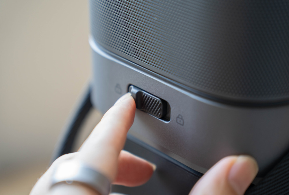 スピーカーを取り外した後のプロジェクター本体側の構造もユニークな本機。中心にプロジェクターユニット本体があり、これを回転させて角度調整することで、壁面や斜め上の天井などに投影できる構造です。