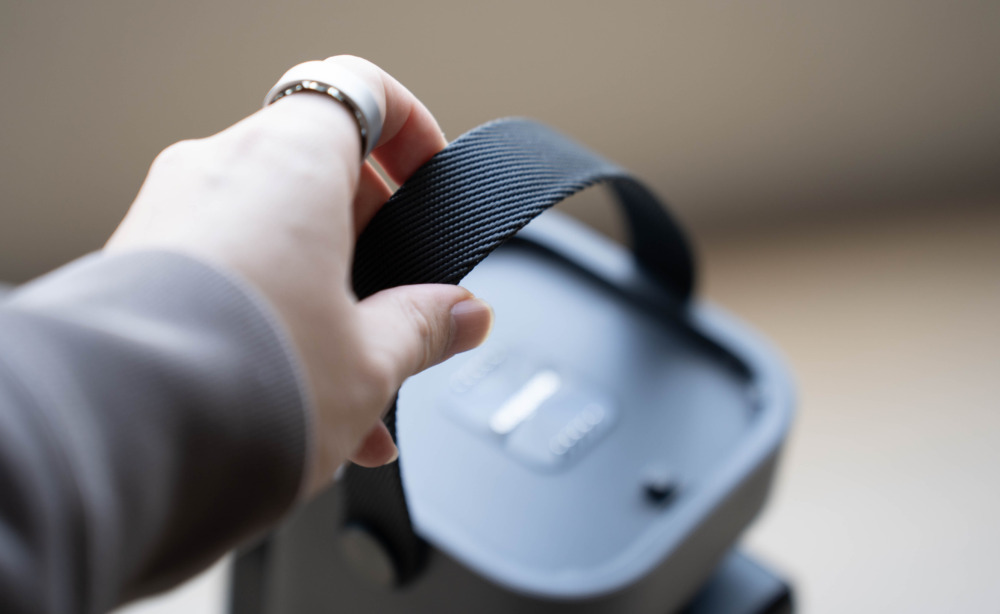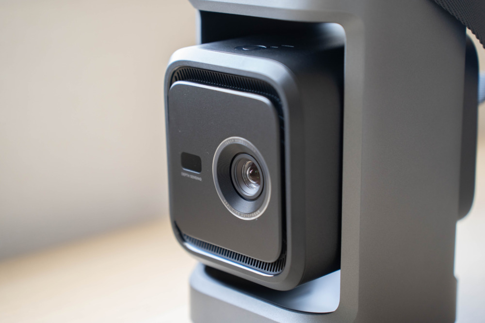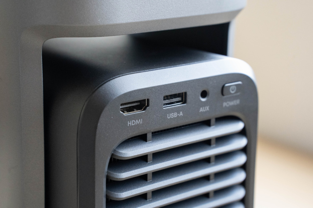 プロジェクター本体にバッテリーは内蔵しておらず、動作には外部からの給電が必須なので据え置き用途向けではありますが、本体にハンドルを備えているので持ち運びはラクラク。このハンドルは好みに合わせて取り外すこともできます。