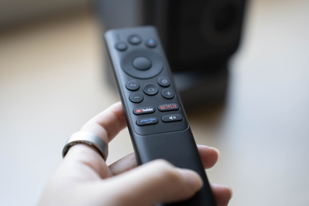 操作は付属のリモコンから行えます。音声操作に対応するほか、Netflix、YouTube、Amazonプライムビデオがボタン一発で呼び出せます。