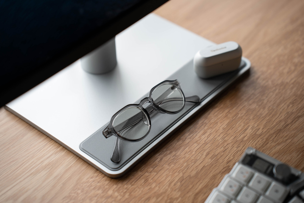 クラムシェルモード時のMacBookをこのパッドに載せることでキズがつきにくく、デスクに直置きせず済むため汚れ防止にもなります。あるいは、ワイヤレスイヤホンなどのガジェットを置くのにもちょうど良いスペースです。