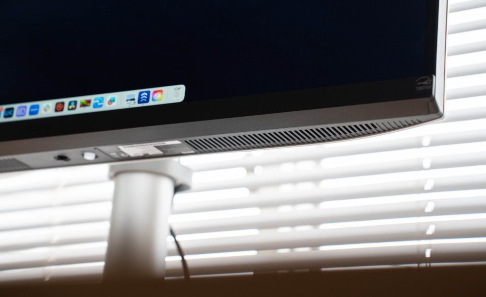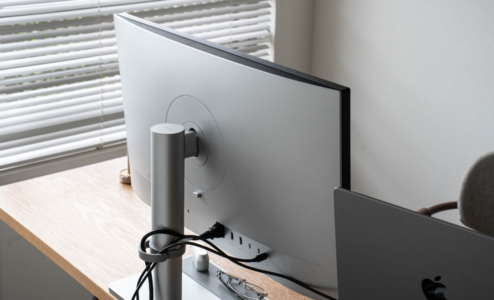 スタンド同様に、画面背面もMacBookのスペースグレーと同系色のシルバー基調です。筆者は、普段からあえてデスクをアイランド配置にするくらいこの背面デザインが気に入ってます。