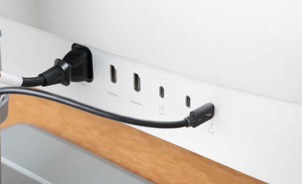 MA270Sの端子類はモニター背面に。HDMI 2.1が2口のほか、Type-CやType-A端子も充実。Thunderbolt 4ケーブルでMacBookと接続した場合は、MacBookへの充電と映像出力をケーブル1本で完結できます。
