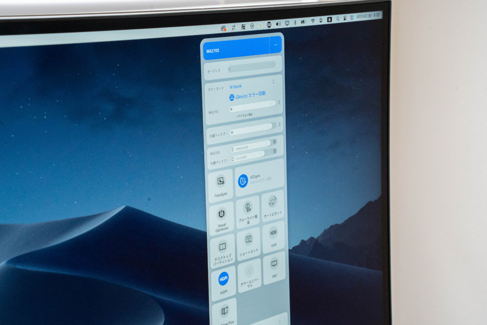 その他、MacBookのキーボード操作での輝度や音量変更にMA270Sを連動させられる「iKeyboard Control」や、周囲の明るさを自動検知し、モニターの輝度を自動調節するVisual Optimizer機能にMacBookが連動する「Brightness Sync」、MacBookのモード変更時にブルーライトやオーディオ調整など丸ごと変えられる「FocuSync」など・・これでもかというくらいMacBookとの連動性に拘り抜かれています。