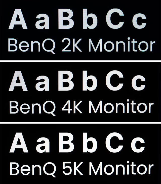 こちら、MacBookを異なる解像度のモニターに接続したときの見え方を表したもの。上から2K、4K、5Kです。5Kの鮮明具合と発光の明るさがよく分かります。