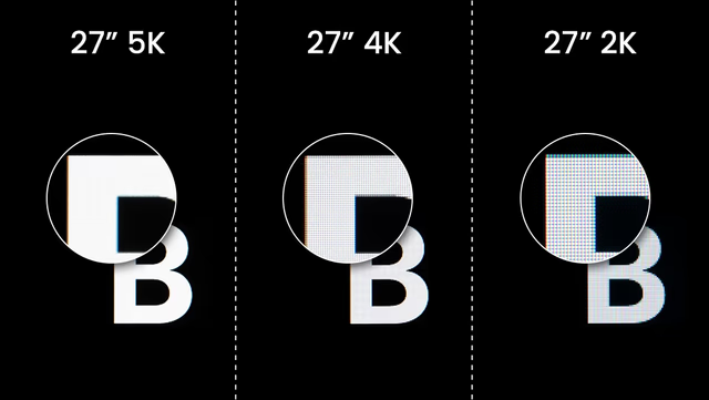 27インチの5Kモニターということで、1インチ当たりの画素密度でいうと218ppiとなります。同じ27インチでも4Kモニターの場合は、画素密度は163ppi止まりです。