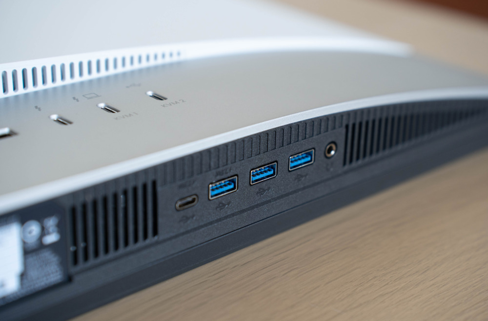 そしてUSBハブ機能は、パネル下部のUSB-C、USB-A 3基と、背面のThundrbolt 4ポートにつないだUSB機器を、KVMと表記のあるThundrbolt 4ポート(KVM1)もしくはUSB-C(KVM2)に接続したPCから利用できます。