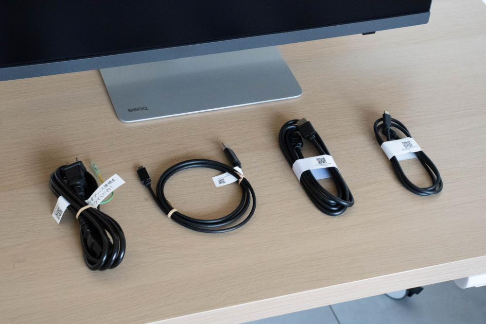 ケーブルは左から、電源ケーブル(1.8m)、USB 3.2(1.8m)、HDMI 2.1(1.8m)、Thunderbolt 4(1m)と一通り揃ってるので、箱から出せばすぐに使い始められます。