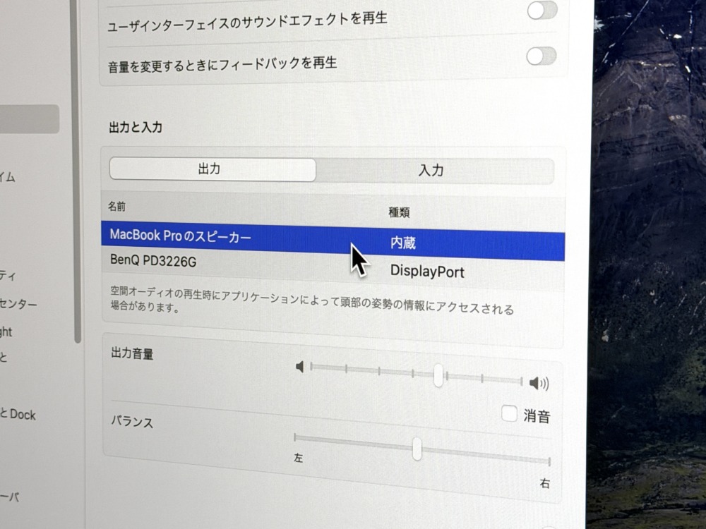 MacBookの内蔵スピーカーの方がふつうに音質は上なので、MacBookの外部ディスプレイとしてPD3226Gを使う際はスピーカーの出力先だけMacに戻しておくのが賢明かなと。