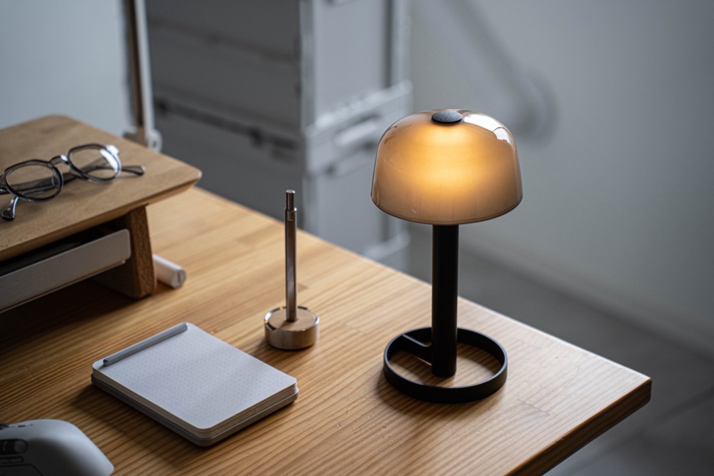スモークのガラスシェードの中でロウソクの炎のように灯る拡散光、眺めてるだけでうっとりしてしまいます…。コードレスでどこでも持ち運べるので、昼は書斎、夜は寝室がこの子の定位置です。