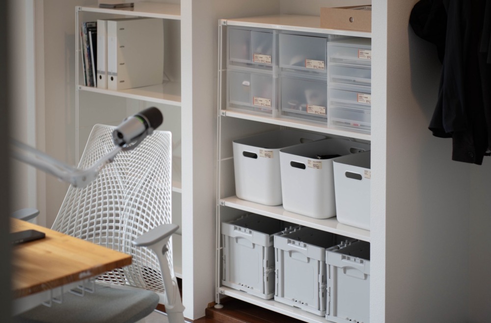 書斎のガジェット棚として新調した無印良品のスチールユニットシェルフ。