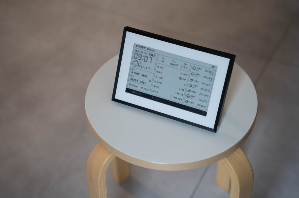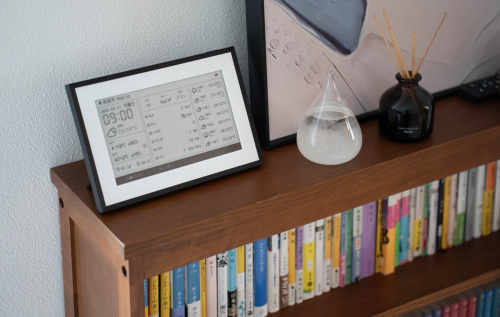 そして、完全コードレスで好きな場所に置けるというのも、E Inkディスプレイを搭載している本機ならでは。省エネ駆動のおかげで、バッテリー持ちはなんと約1年間。ダイニングテーブルの上でも、棚の上でも、玄関でも、電源の位置に縛られず好きなところに置けます。