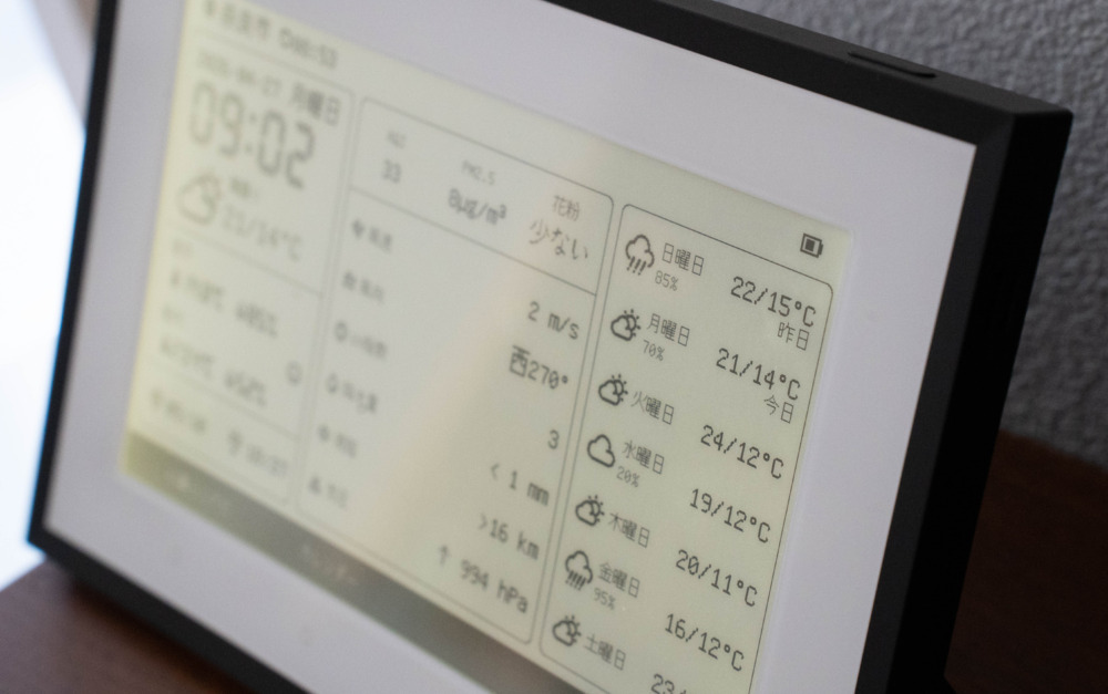 ふだんの部屋の中での定位置や、生活動線の間にポンと置いておけば、当日の天気予報と気温、湿度が自然と目に入る。「折りたたみ傘をバッグに入れておこう」とか「気温が低めだから上着を持っていこう」とか、その日の持ち物や服装を瞬時に判断できるというのが本当に快適なんですよ。