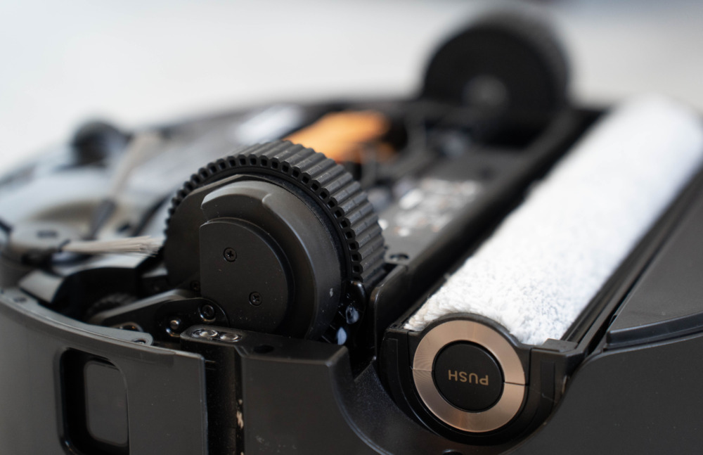 加圧式のロール型モップを採用するAqua10 Ultra Rollerは、雑巾掛けのように「押して拭く」水拭きが可能。また、カーペットを感知するとモップが自動で持ち上がるので、濡らしてしまうこともありません。