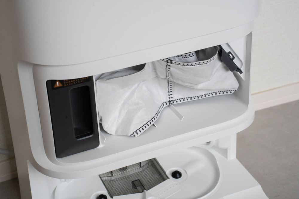 で、約3Lの大容量ステーションになんと約100日分のゴミを貯めておけるんです。つまり、本機を継続使用するにあたって人間が手を動かすこといえば、基本的に年に3、4回このステーション内のダストパックを交換(水拭き使用時は汚水・清水タンクの取り換え)することだけ。