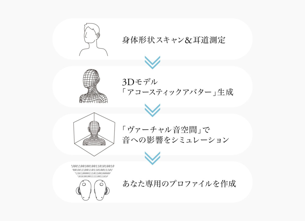 簡単に言うと、頭と耳の形をスキャンして仮想で自分ダミーヘッドを作って、自分にピッタリの音色を作ってくれるワイヤレスイヤホンといった感じです。