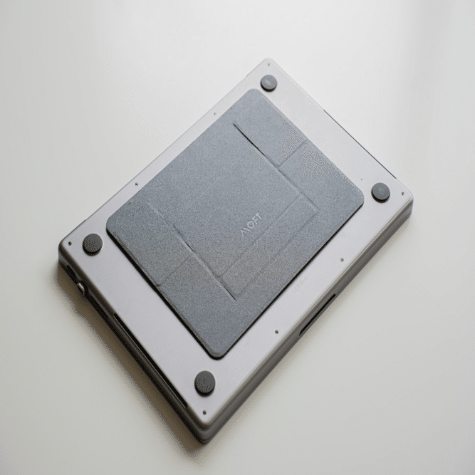 MacBookの底面に貼り付けるだけで、画面の位置を上げて首や肩の負担を軽減できるMOFTのPCスタンド。キーボードに角度をつけて、タイピングの負担も減らせる一石二鳥アイテムです。