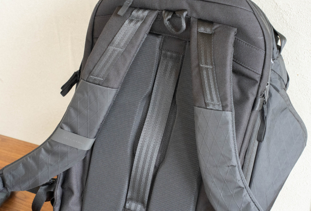 約1週間使用した感想を一言で表すなら、着ているような背負い心地。Daily Backpack時代から“無重力バッグ”と形容される同シリーズですが、容量拡張と同時にクッション性、荷重分散ともにたしかなアップデートが感じらます。また、背面パッドは通気加工されているので、炎天下に重い荷物を背負った日でも背中が蒸れないというのが非常に快適です。