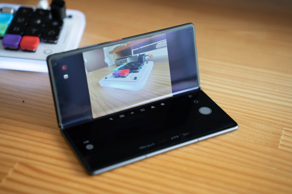 本体をL字に開いたときに、カメラアプリは上下で表示が分割されるフレックスモードに対応。本体を机の上に置いて写真を撮るときなどに便利な機能です。