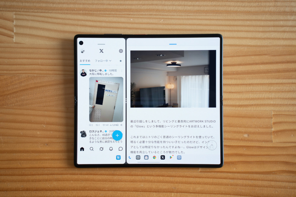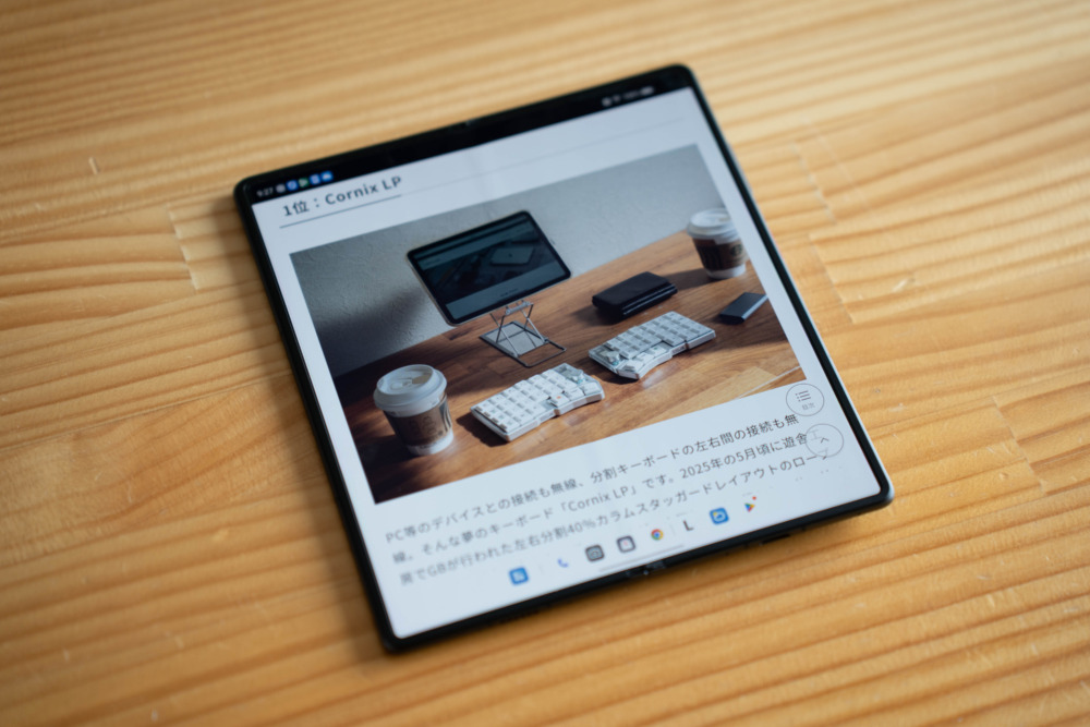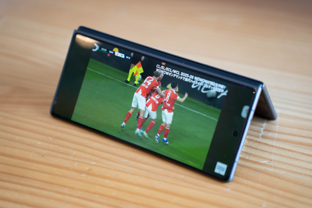 フォルダブルの要とも言えるヒンジですが、GalaxyやPixelと比べるとやや跳ね返りを感じるというか、グニャっと曲がるような挙動でややクセがあります。言葉で表現するのがちょっと難しいのですが、特定の場所に安定して固定しづらい感触。