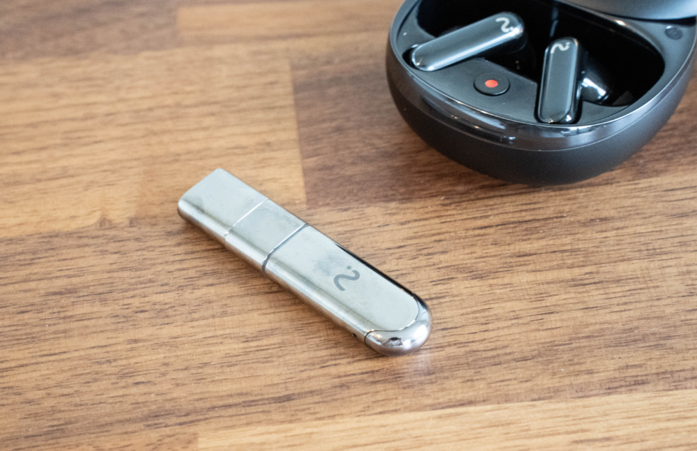 スマホ上の通話・音声と対面会議の音声を録音できるイヤホンに対し、NoteKitはPC上の音声を記録できるというもの。光沢感のあるクローム調でコンパクトながらイヤホン同様に上質感があります。