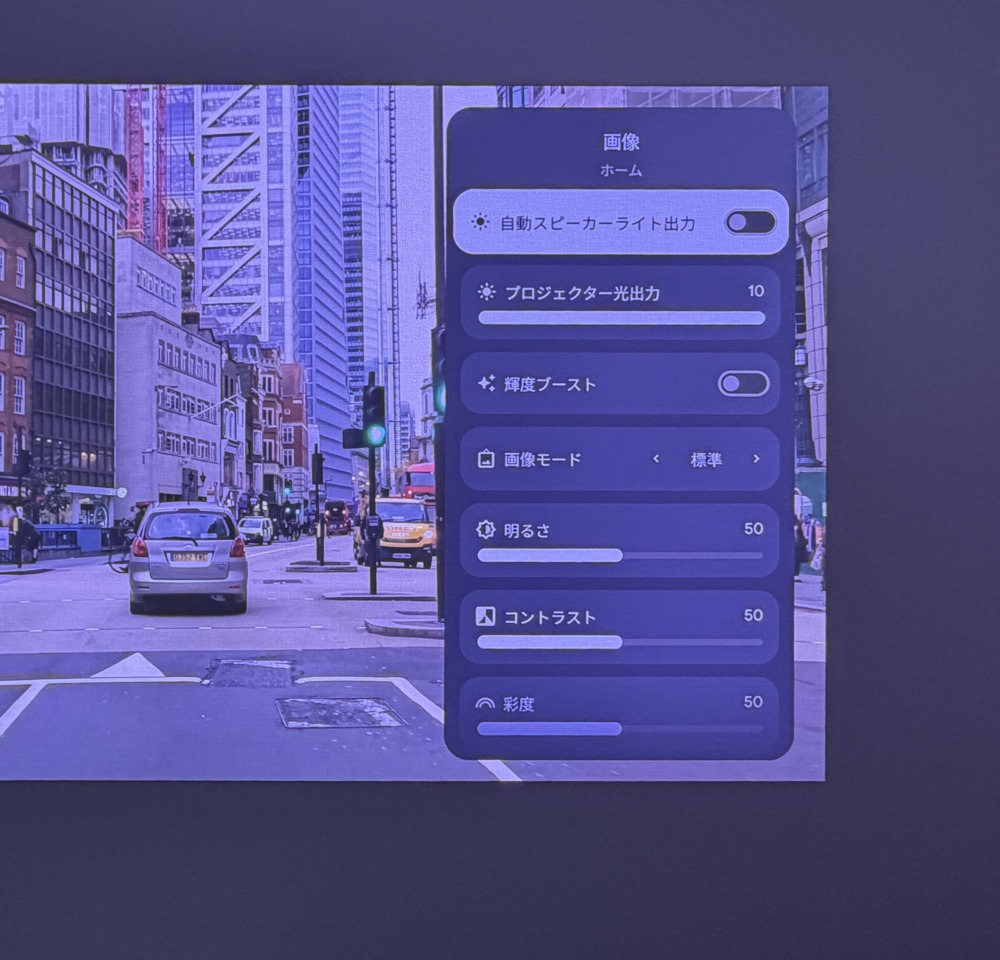 明かりを落とした環境下ではむしろギラギラ眩しいくらい明るいので、わが家では時間帯にかかわらずあえて輝度を落として視聴するほどです。段階的な明るさ調整、自動輝度調整のほか、映像モードの設定など自分好みに細かくカスタマイズできます。