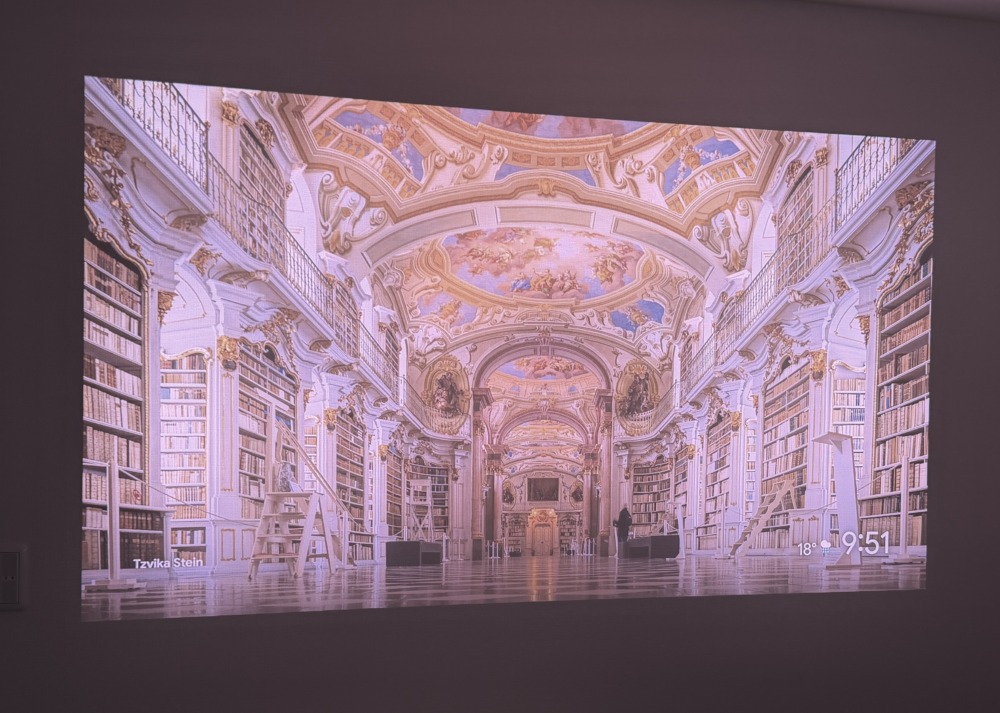 最大投影サイズは300インチ対応であり、今回は6畳の書斎の壁から壁、2.5mほどの投射距離で約100インチの投影ができました。